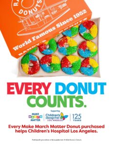 All month long, Randy’s Donuts locations (Inglewood, El Segundo, Torrance, Santa Monica, Pasadena, Downey and Costa Mesa) are giving back in a sweet way to Children’s Hospital Los Angeles donating 20% of sales from the special, limited-edition Make March Matter Donut.